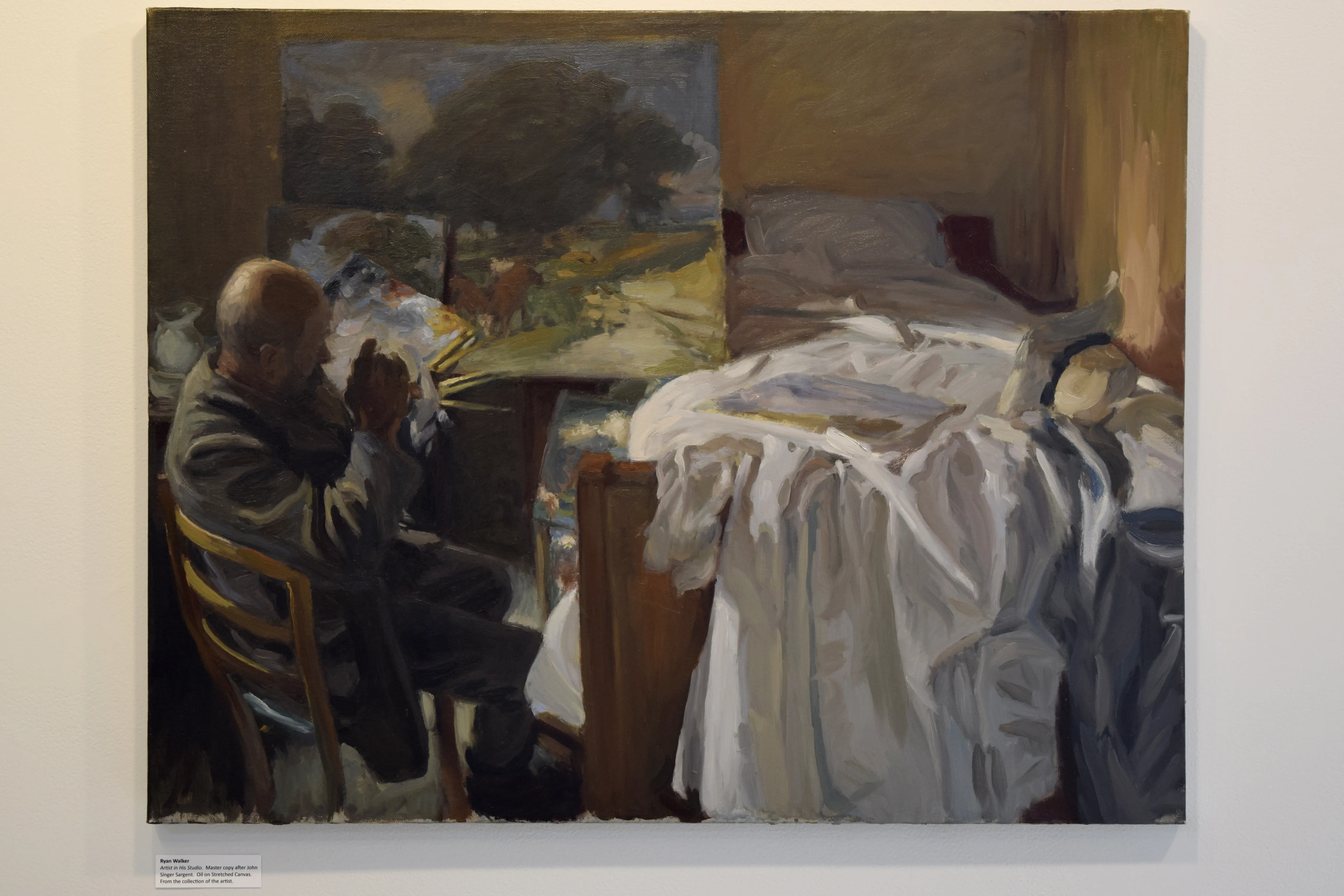 Visual Arts Teacher Ryan Walker contributes a thoughtful collection of oil paintings, including "Forty Steps Beach" (2025), "Sketch at the Cross" (2025), "Sketch of Mom with Roscoe" (2025), and "William and George (Sketch)" (2025), as well as "Dad’s College Mitt" (2015) and "Rainbow Sweater" (2023). His work also includes "Artist in His Studio," a master copy after John Singer Sargent, highlighting both technical skill and reverence for the tradition of classical painting.