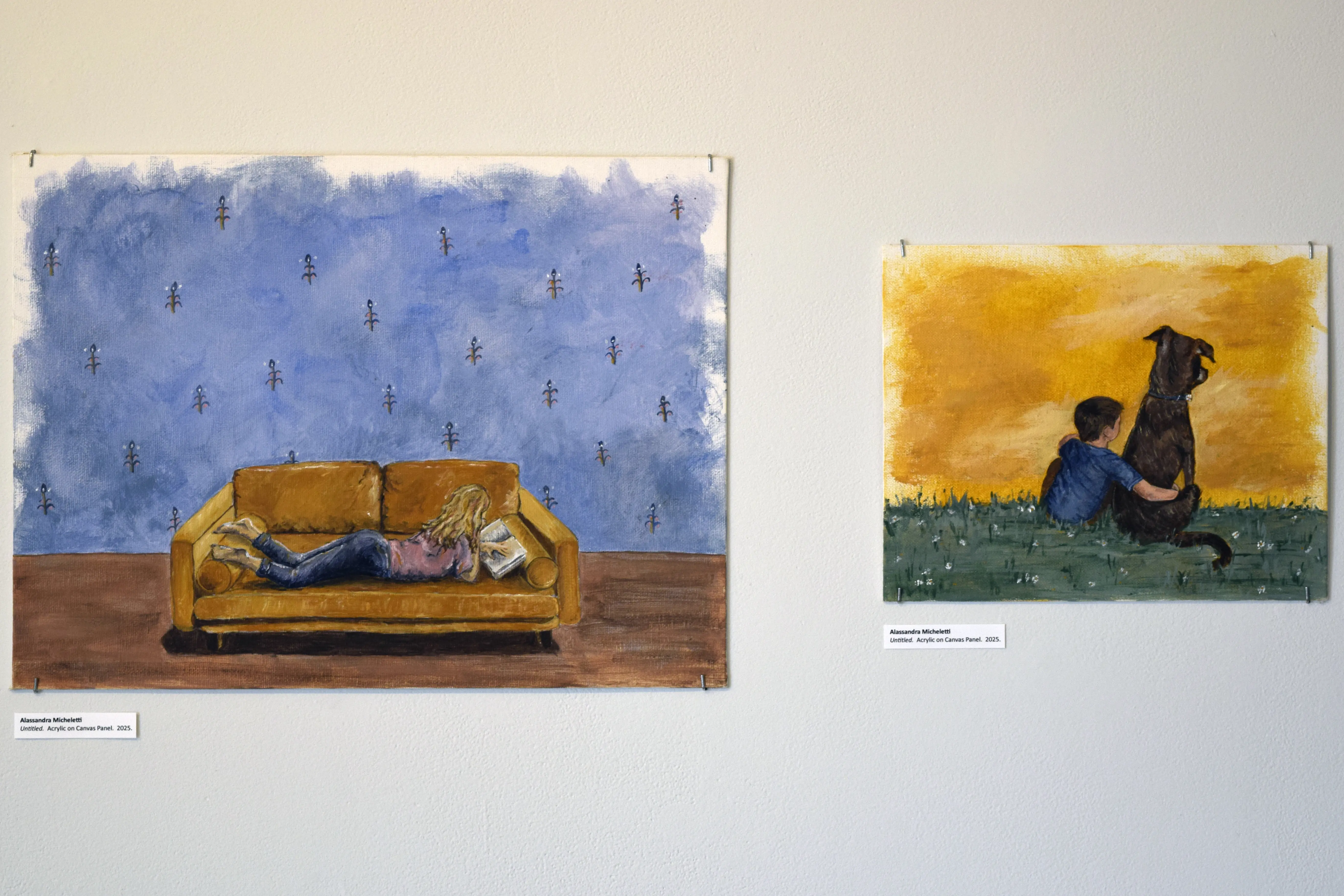 The show also includes two new untitled acrylic works by Alassandra Micheletti ’05, Art History teacher, depicting endearing and nostalgic scenes of childhood.