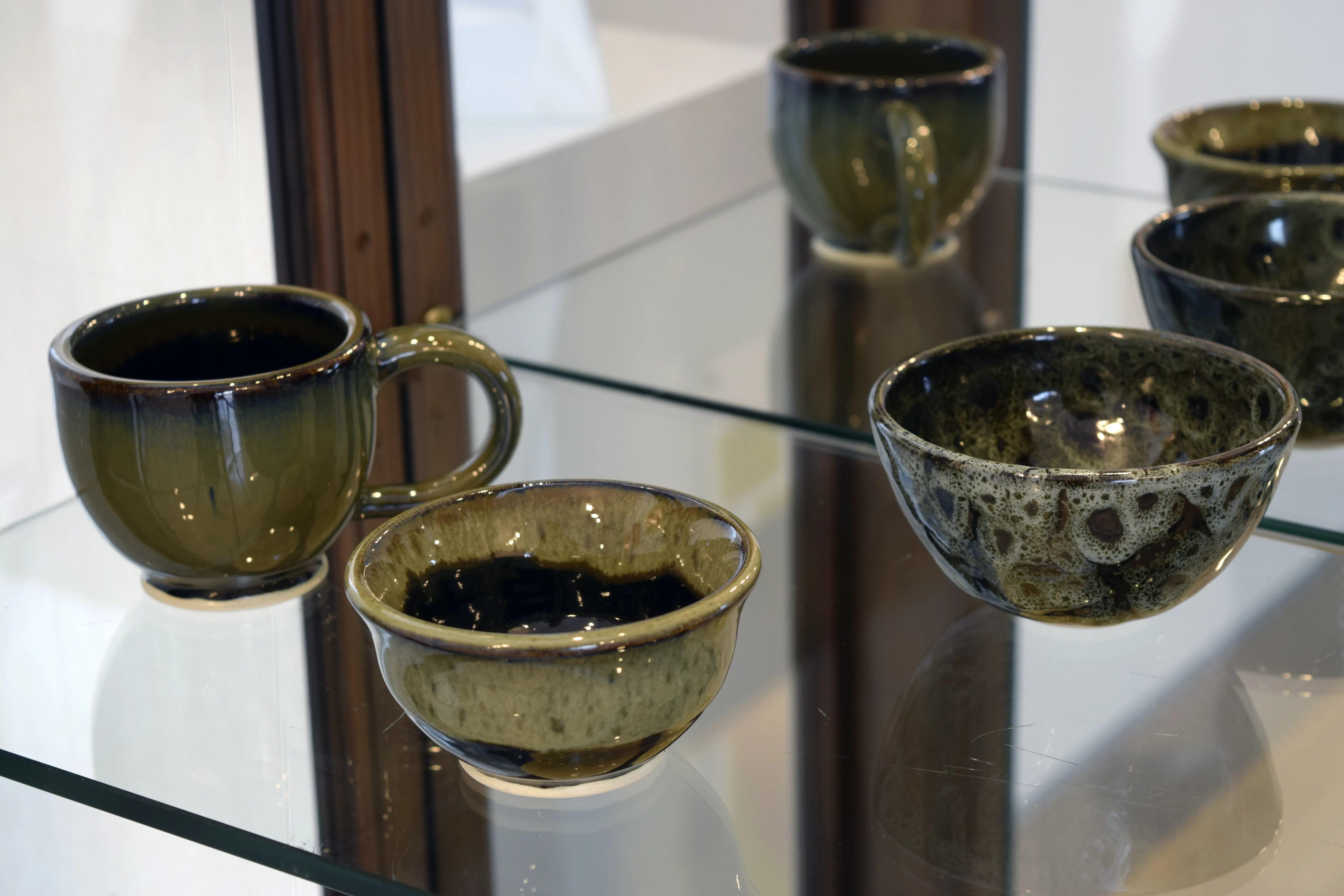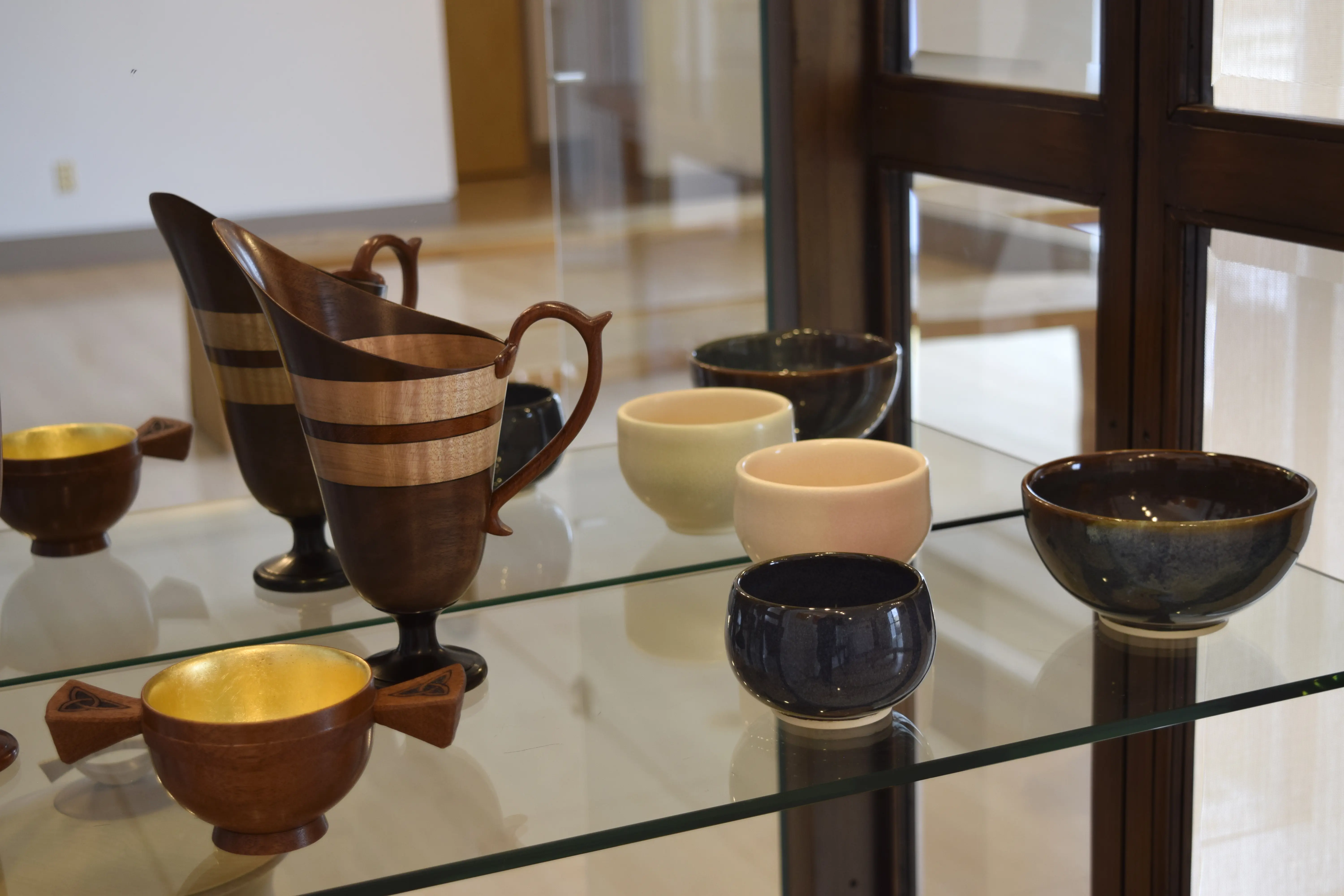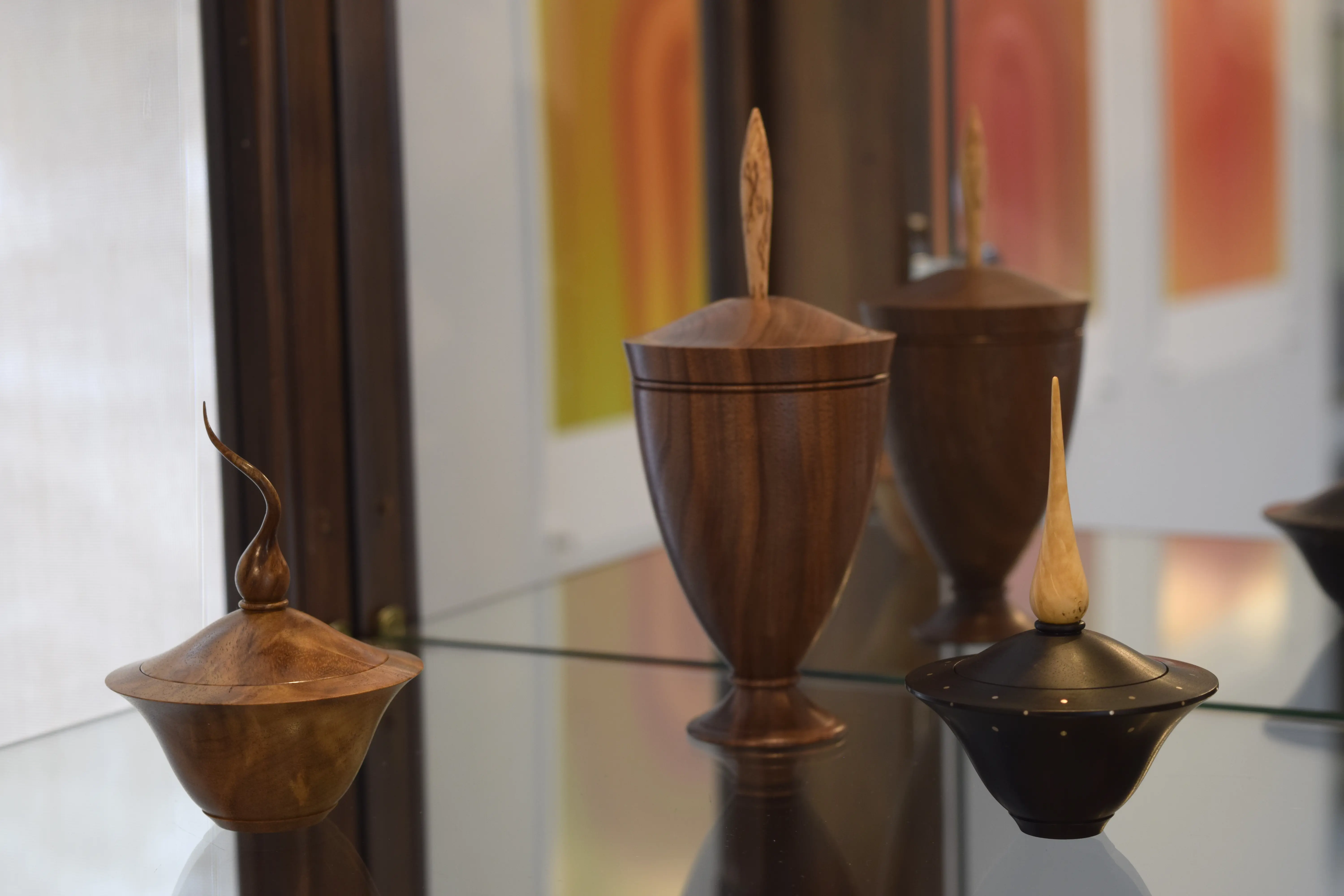 In addition to the wall-hung works, the display cabinet features an extensive selection of Mark Nadeau’s functional and sculptural objects, including wheel-thrown white stoneware mugs, bowls, pots, and tea bowls, as well as finely crafted lidded endgrain and facegrain boxes made from woods such as cocobolo, curly myrtle, black walnut, gabon ebony and quilted Norway maple. Standout pieces include "Determination," a lidded facegrain box in black cherry with stainless steel, and "Quaich," made of mahogany with 23K gold leaf and pyrography.
